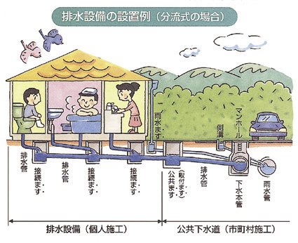 公共下水道が完成して供用開始の公示がされますと、皆さんのご家庭の排水設備を公共下水道につなぐ工事をすみやかに行っていただくことになります。